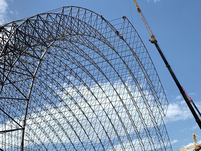 (2)网架加工前应对现场尺寸进行复测,确认无误后方可进行加工、安装;网架制作、运输、安装应遵守《空间网格结构技术规程》JGJ7-2010、《钢网架青岛螺栓球节点》JG/T 10-2009、《钢网架青岛螺栓球节点用高强度螺栓》 GB/T 16939-2016、《青岛钢结构青岛工程青岛施工规范》 GB50755-2012、《青岛钢结构青岛工程施工质量验收标准》 GB50205-2020。